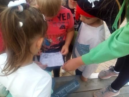 10 июля команда отважных пиратов отправилась на поиски клада Флинта. В начале приключений все прошли обязательный ритуал «Посвящение в пираты». Затем команда отправилась искать сокровища по подсказкам пирата Билли Бонса. В результате клад был найден, команда довольна, потому что все получили призы за участие.