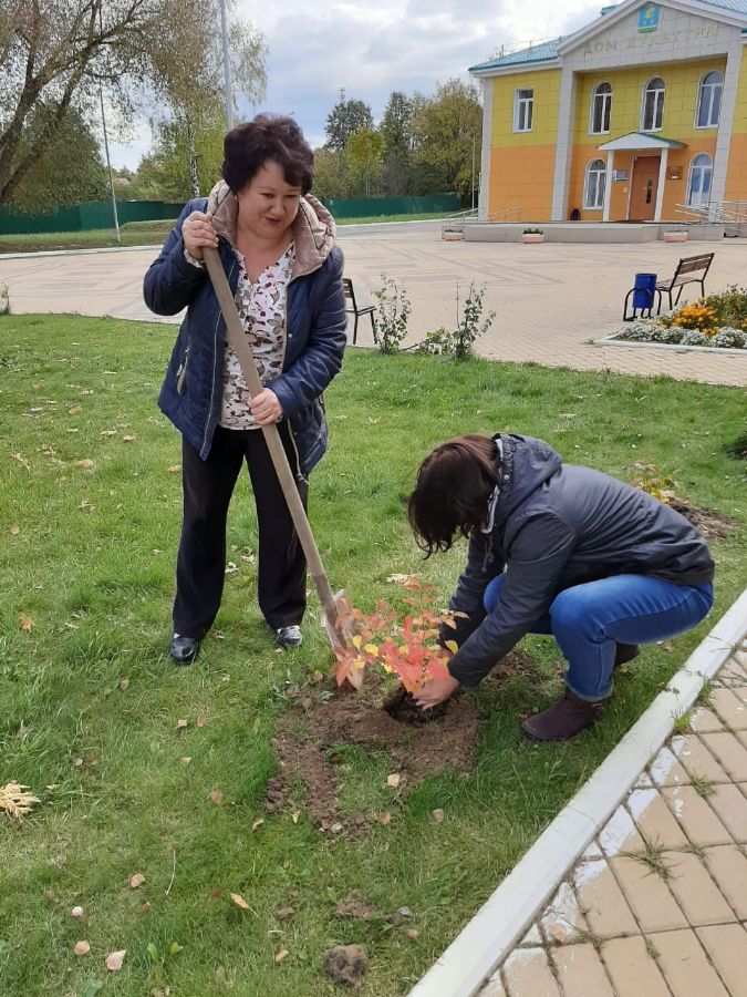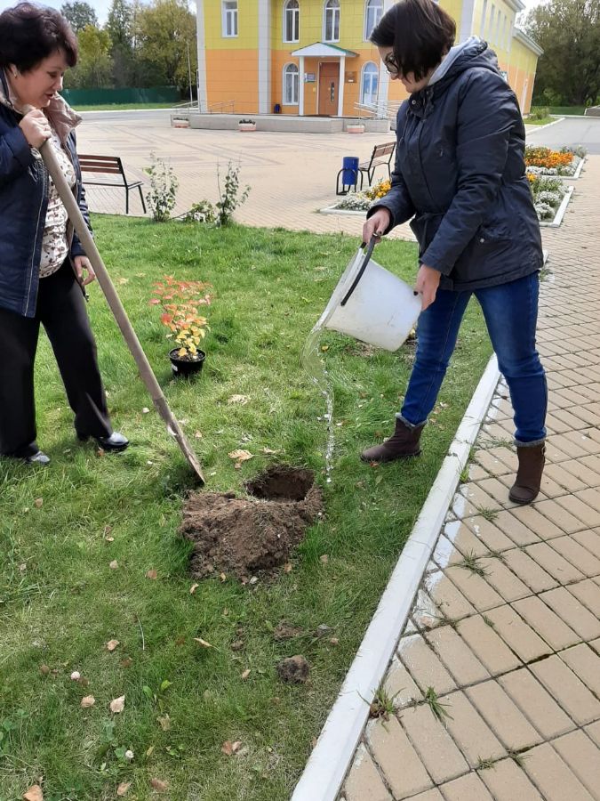 25 сентября солнечный довольно тёплый день. Посадка кустарников на территории ДК.
